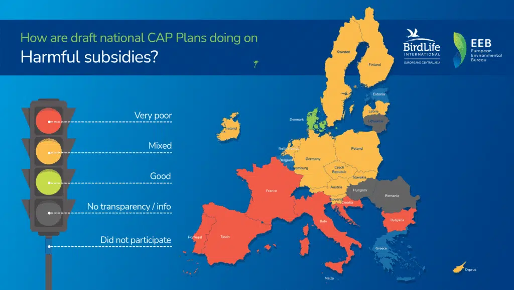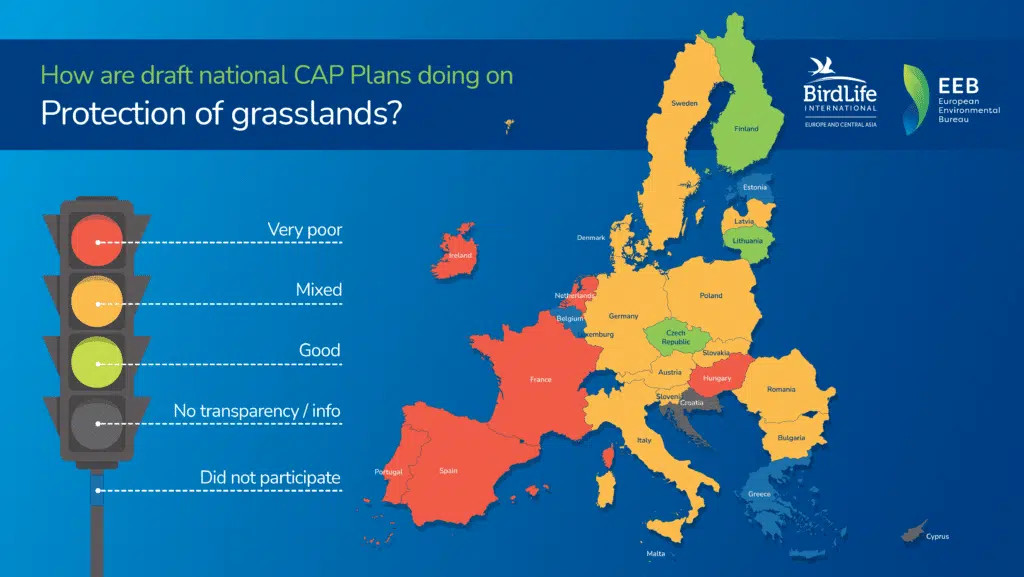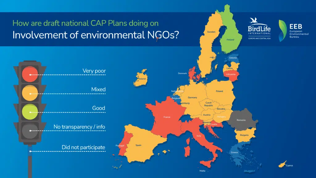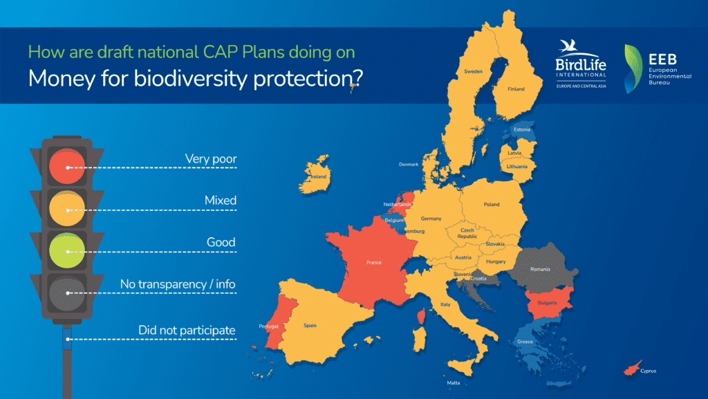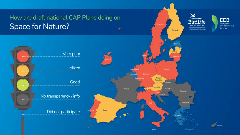 BirdLife Europe i Europejskie Biuro Ochrony Środowiska (EEB) we współpracy z ekspertami w dziedzinie rolnictwa z 22 krajów podjęli trud oceny dostępnych roboczych wersji planów strategicznych WPR pod kątem siedmiu kluczowych kryteriów. Kryteria te dotyczyły zgodności WPR z europejskim Zielonym Ładem. Wyniki zobrazowano używając drogowej sygnalizacji świetlnej. Przedstawiona ocena krajowych planów strategicznych WPR opiera się na informacjach dostępnych do 10 listopada br., natomiast ostateczna ocena może być inna, ponieważ prace na planami strategicznymi nadal trwają.