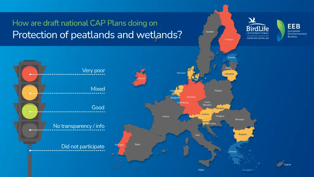 Żaden z ocenianych krajów nie wprowadził skutecznych środków ochrony torfowisk i terenów podmokłych. W 7 krajach (Litwa, Dania, Holandia, Austria, Słowenia, Słowacja, Rumunia) proponowane środki mogą spowolnić ich degradację, ale prawdopodobnie nie zatrzymają jej całkowicie. Brakowało informacji z 11 krajów. Obecnie wiadomo już, że w Polsce wchodząca w skład warunkowości (normy, które będą musieli spełnić wszyscy rolnicy otrzymujący płatności bezpośrednie) norma GAEC2 dotycząca ochrony torfowisk i terenów podmokłych będzie obowiązywała dopiero od 2025 roku. Ponadto nie zaproponowano żadnych nowych rozwiązań, które pozwalałyby na skuteczniejszą ochronę torfowisk i terenów podmokłych. Dla przykładu nie polscy rolnicy nie będą mogli skorzystać ze wsparcia pozwalającego na rozwój paludikutury – zrównoważonego użytkowania terenów podmokłych do celów rolniczyczych (o paludikulturze pisaliśmy więcej tutaj).