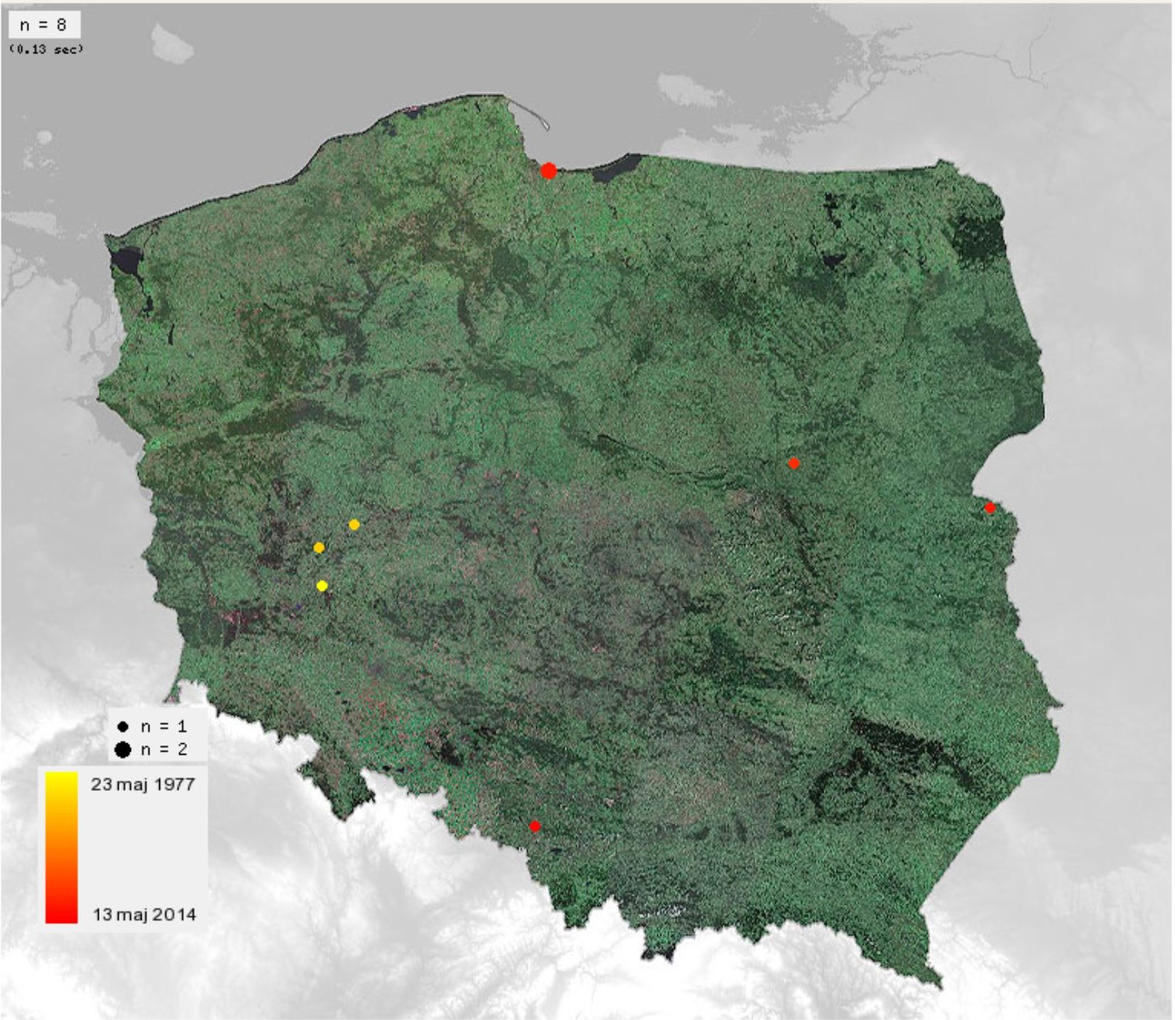 Rozmieszczenie obserwacji dzierzby czarnoczelnej, które zostały wprowadzone do ornitho. Czerwone kropki pokazują stwierdzenia z lat 2008-2014. Kropki w kolorze żółtym to obserwacje z lat 1977-1984, a więc z czasów gdy gatunek był znacznie liczniejszy w Polsce, które trafiły do ornitho.pl razem z innymi archiwalnymi danymi Leszczyńskiej Grupy OTOP