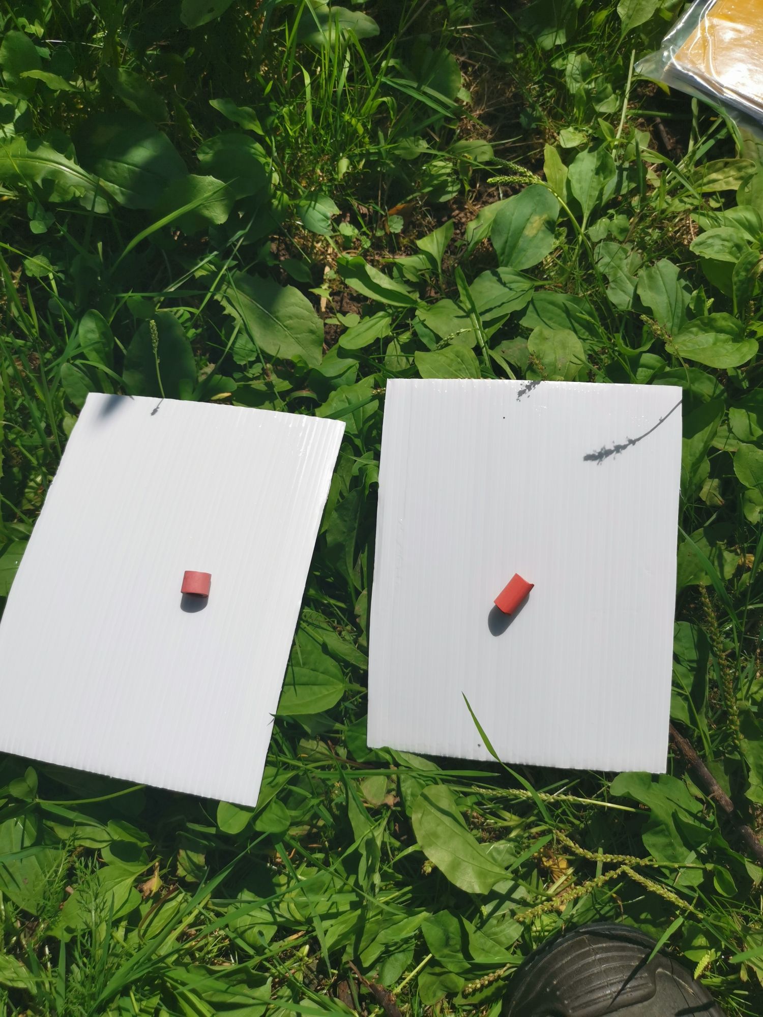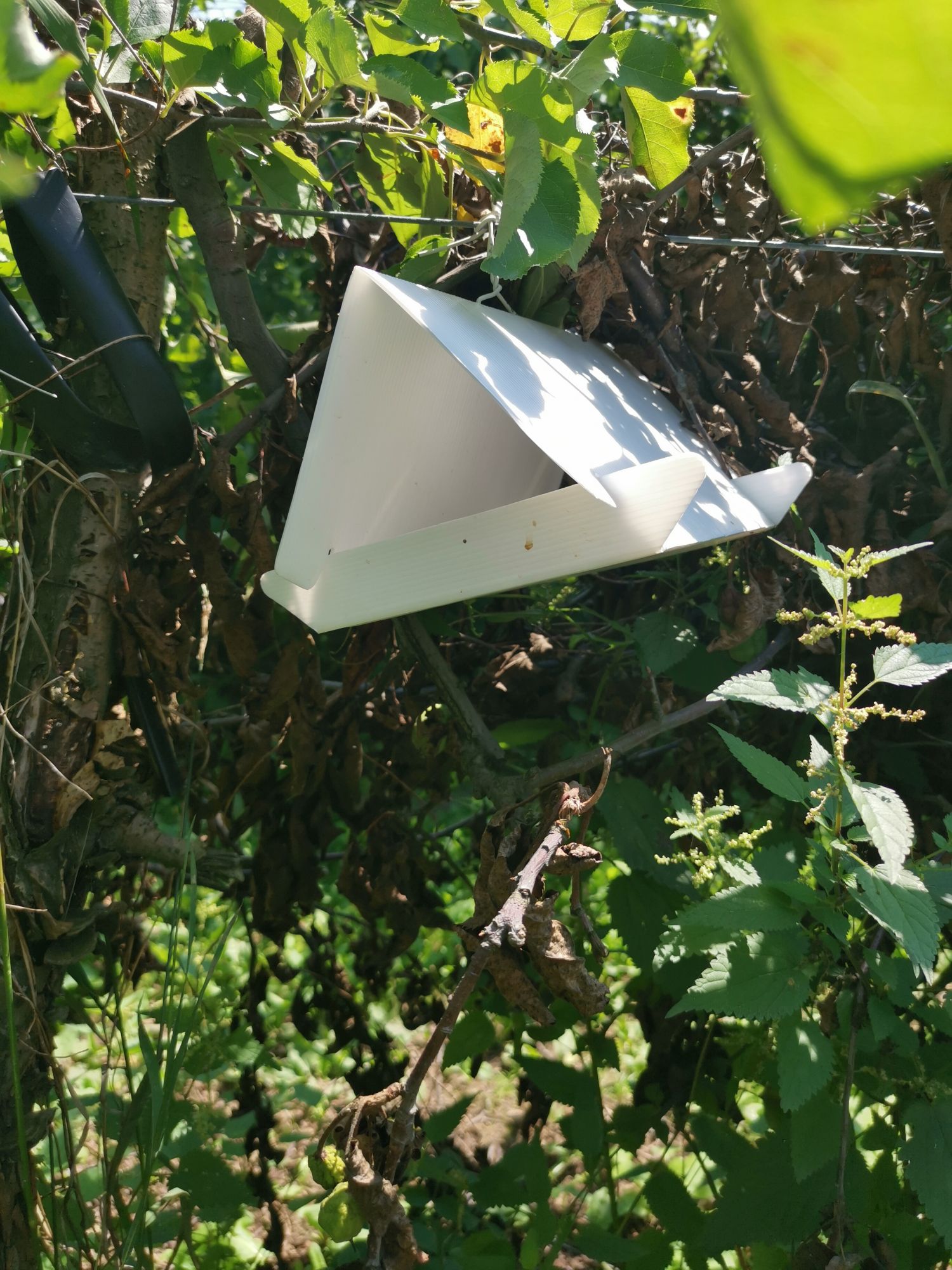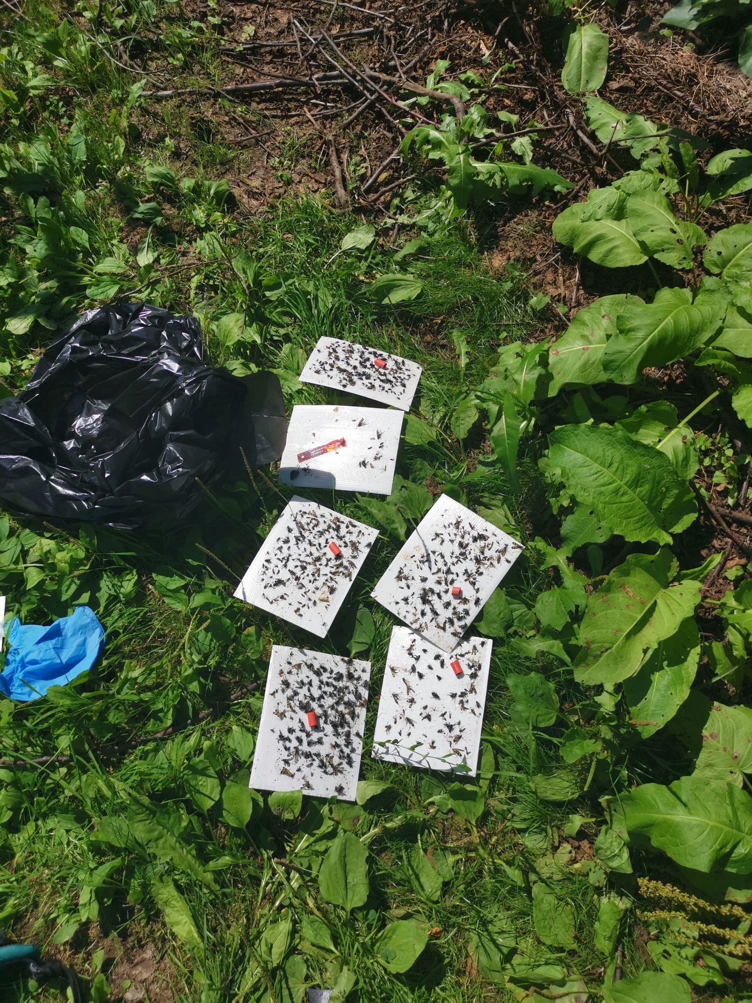Monitoringiem objąłem 6 gatunków, w tym znaną i lubianą owocówkę jabłkóweczkę. Skuteczną i uznaną naukowo metodą monitorowania populacji tych owadów jest odłów postaci dorosłych w pułapki (takie białe „domki” jak na zdjęciu, zawieszone w sadzie) z atraktantem w postaci feromonu płciowego typowego dla danego gatunku, który nakłada się na podłogę lepową. Pułapki są selektywne względem gatunku szkodnika i pozwalają ocenić termin i intensywność nalotu. Oczywiście poza tym wybranym gatunkiem, do lepu przykleja się też przypadkowo trochę innych owadów, zwłaszcza much i przezierników, trawa, obserwator, druga ręka obserwatora… ale te, które mnie interesują są łatwe do rozpoznania.