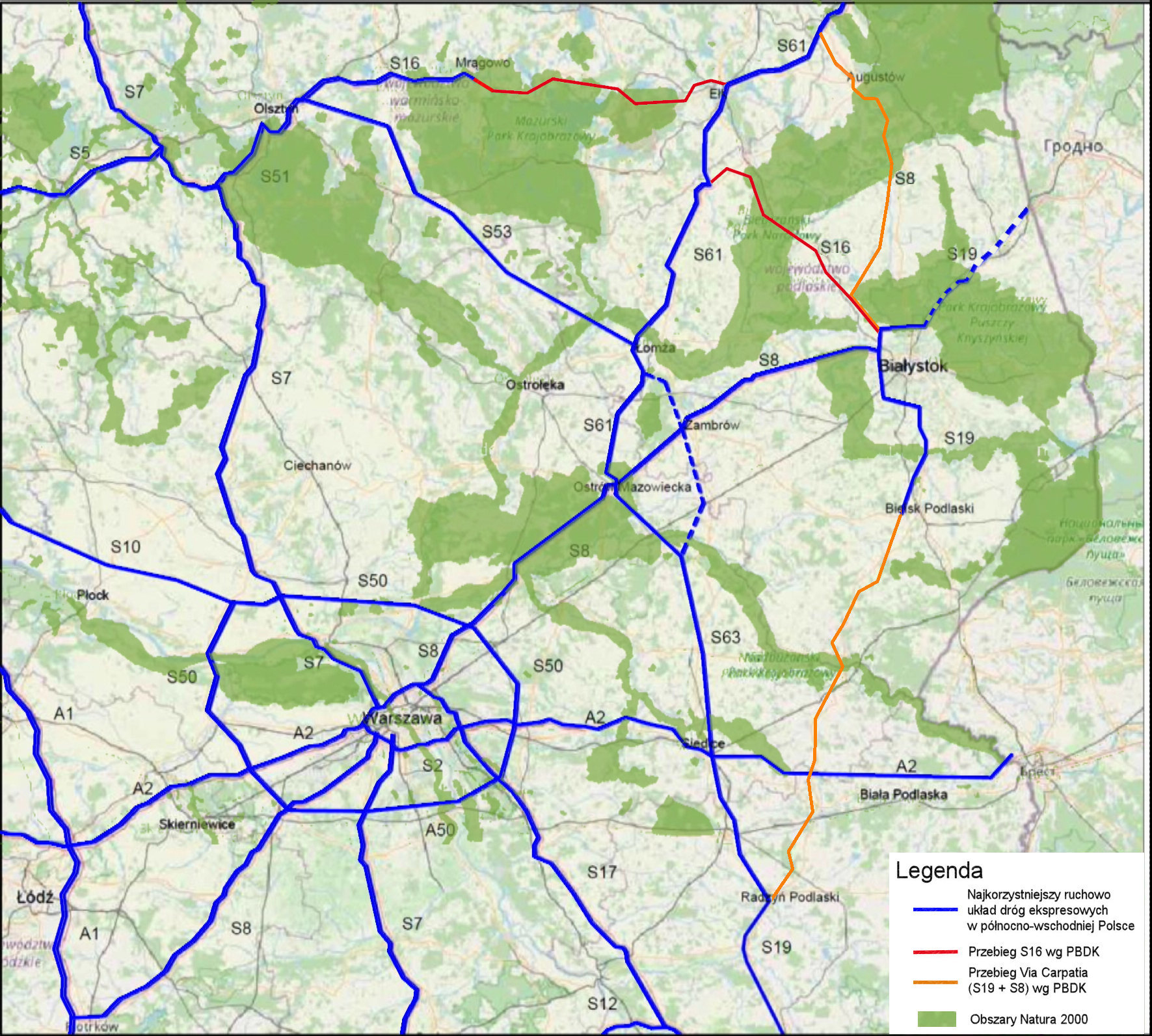 Ogłoszony przez poprzedni rząd, na fali parlamentarnej kampanii wyborczej, nowy „Program Budowy Dróg Krajowych do roku 2030 i na lata następne” dodaje do sieci transportowej drogę ekspresową S8 na odcinku Knyszyn – Raczki w województwie podlaskim. Droga ta miałaby przebiegać przez Biebrzański Park Narodowy (okolice Sztabina) oraz przez ostoje Natura 2000 w Puszczy Knyszyńskiej i Puszczy Augustowskiej. Projekt ten jest nawiązaniem do planowanej ponad dekadę temu drogi „Via Baltica”. Wcześniej była ona analizowana jako wariant alternatywny przebiegu S16 przez Biebrzański Park Narodowy w okolicy Osowca. Obecnie w nowym PBDK są wpisane dwie drogi ekspresowe: S16 w okolicy Osowca Twierdzy i S8 w okolicy Sztabina!