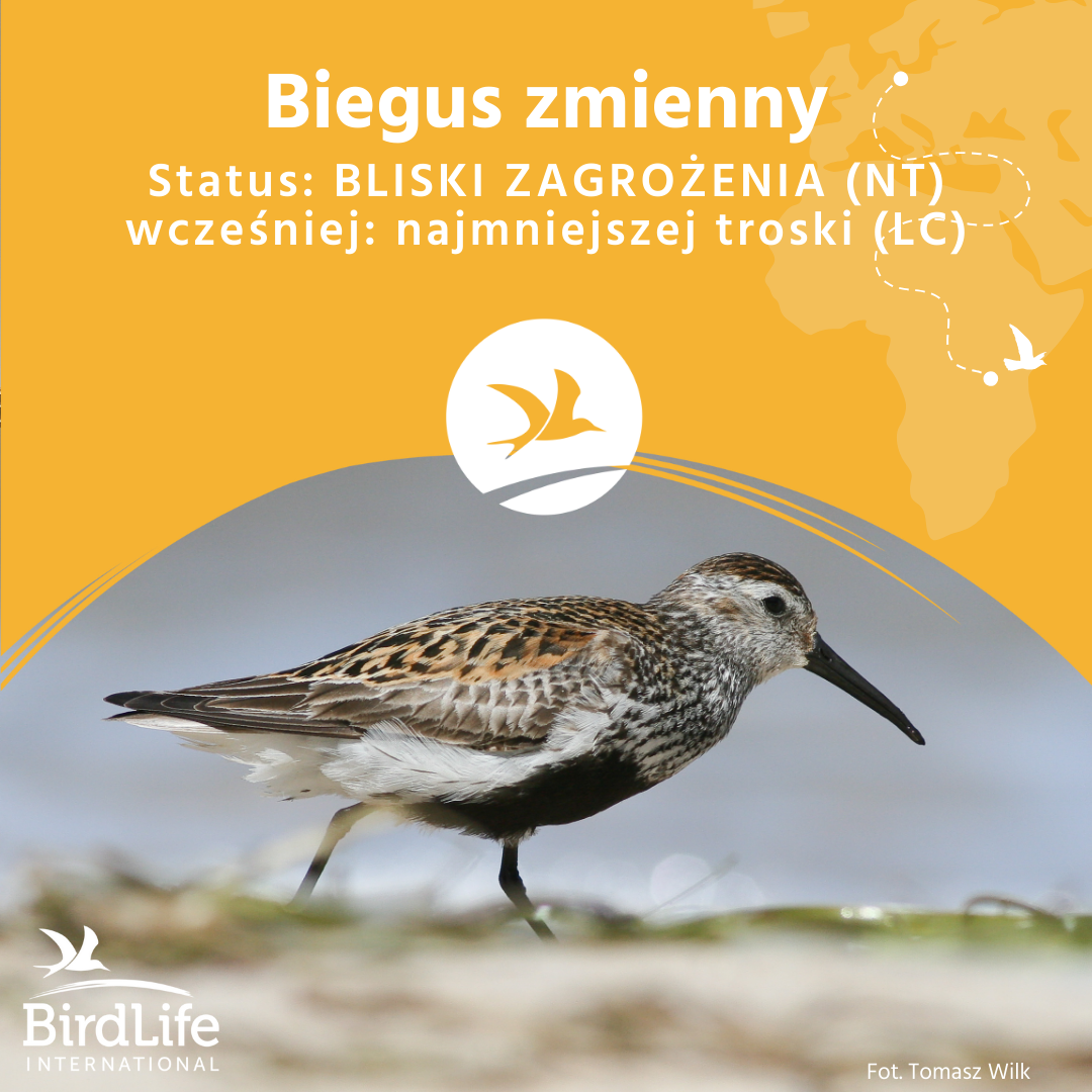 – Biegus zmienny Calidris alpina, którego liczebność zmniejszyła się o co najmniej 20%, szczególnie wzdłuż amerykańskich szlaków migracyjnych. Poprzedni status w Czerwonej liście: LC (gatunek najmniejszej troski), obecny status: NT (bliski zagrożenia). W Polsce gatunek uznany za wymarły regionalnie (RE) (CLPP). Ostatni lęg biegusów zmiennych miał miejsce w 2004 roku. O Monitoringu Biegusa Zmiennego PMŚ GIOŚ pisaliśmy w trakcie Ptasiego Tygodnia z OTOP: Monitoring Ptaków Polski.