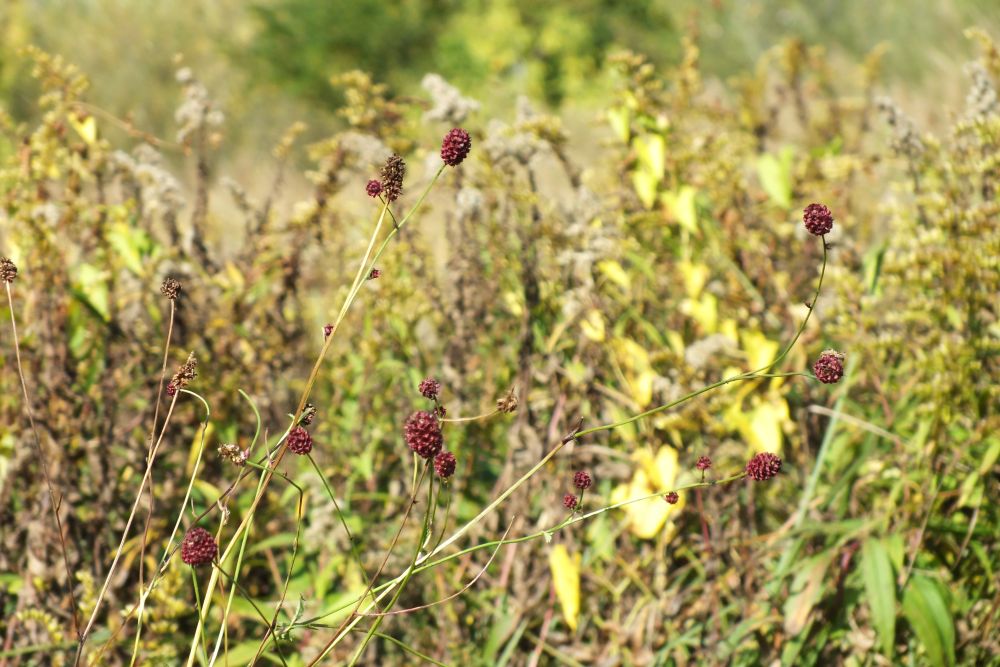 Krwiściąg lekarski, roślina łąk wilgotnych, od której uzależnione jest występowanie rzadkich motyli: modraszka telejusa i modraszka nausitousa. W tle widoczne łany nawłoci (północnoamerykańskich), obcego gatunku inwazyjnego, zagrażającemu krwiściągowi i motylom. Fot. Rafał Bobrek