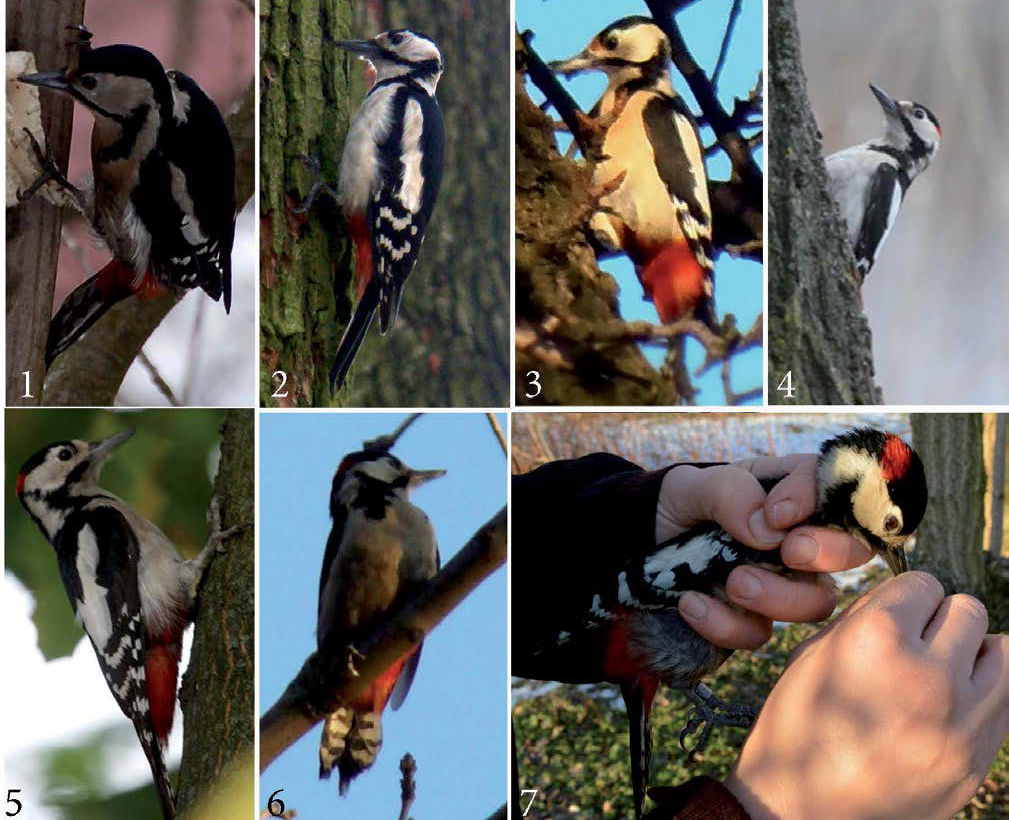 Przykładowe dzięcioły o cechach mieszańców dzięcioła białoszyjego i dzięcioła dużego. 1 – Rybna, 2013, Jacek Niemiec; 2 – Grodzisk Mazowiecki, 2015, Tomasz Figarski; 3 – Sułów, 2013, Łukasz Kajtoch; 4 & 5 – Orońsko, 2013 & 2015; 6 – Wieliczka, 2015, Tomasz Figarski, Paweł Malczyk; 7 –Warszawa, 2013, Marek Elas. Rycina oryginalna opublikowana w Journal of Ornithology. 159: 311-314.