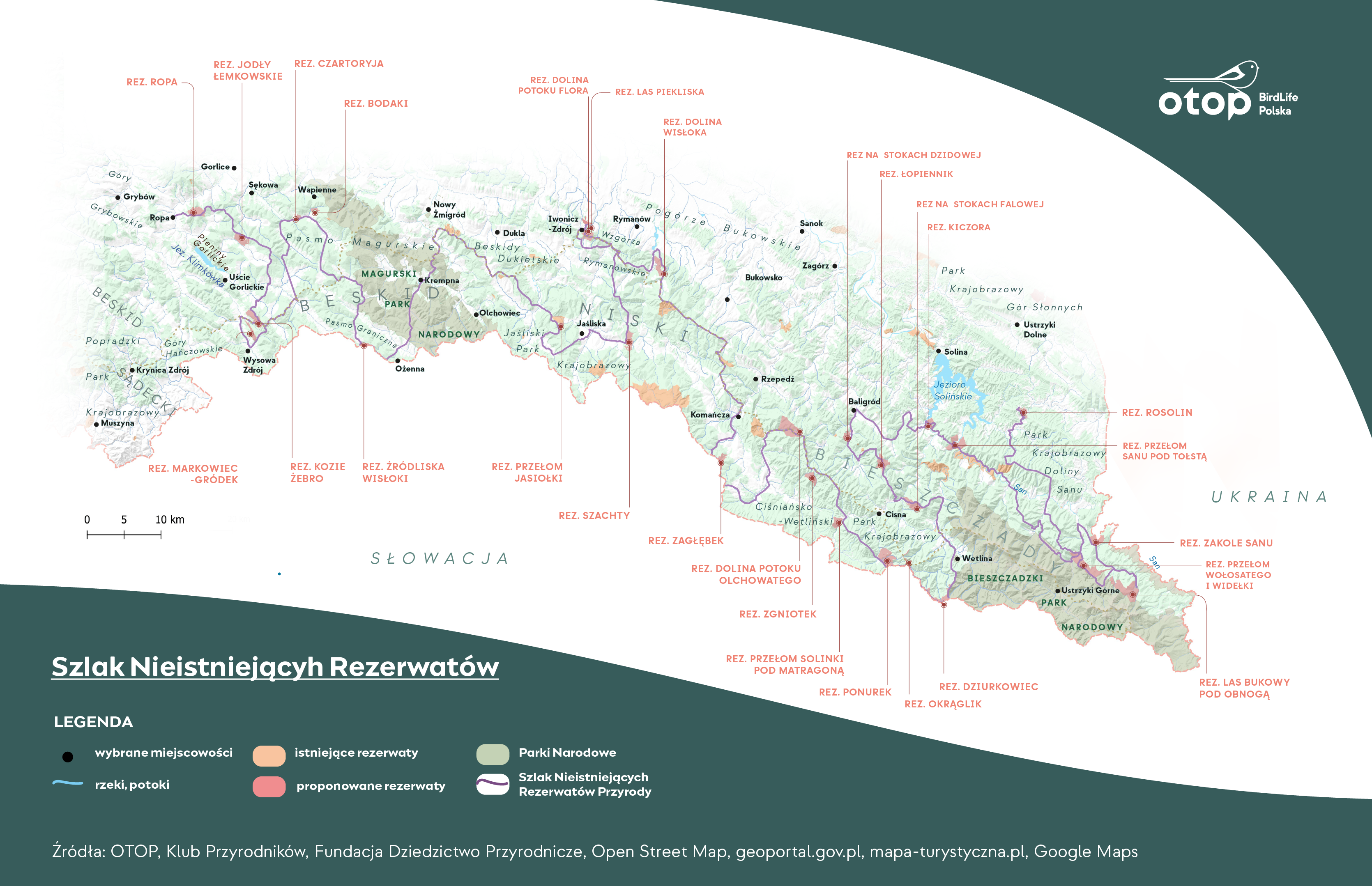 By ułatwić Wam znalezienie i poznanie tych miejsc, a także zachęcić do wspierania ich ochrony, przez niepowołane rezerwaty regionu przeprowadziliśmy “Szlak Nieistniejących Rezerwatów”. Wytyczona ścieżka prowadzi istniejącymi wcześniej szlakami pieszymi i drogami, z położonej w Beskidzie Niskiem Ropy aż do leżącego w Bieszczadach Rosolina i odwiedza aż 28 wymagających najwyższej ochrony zakątków.