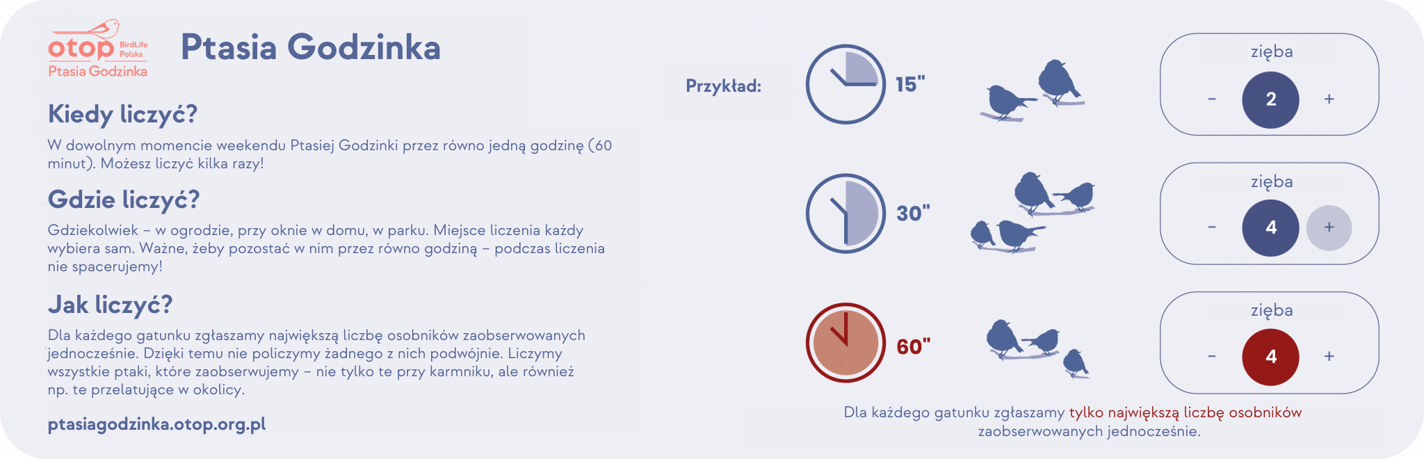 Na stronie akcji znajdziesz dotychczasowe wyniki akcji, szczegółowo opisaną metodykę liczenia oraz wskazówki dotyczące dokarmiania ptaków, a także materiały pomocne w identyfikacji najczęstszych skrzydlatych gości naszych karmników i quizy.