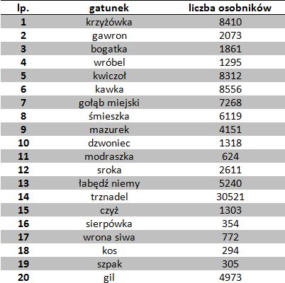 Tabela 1. – Lista 20 najliczniej spotykanych gatunków podczas Zimowego Ptakoliczenia 2012
